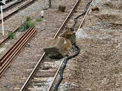 大和路線平野駅電車から窓の外を見ていたら線路の上に大きな岩が乗っているのが見えました。数日経ってもそのままになっていたので平野駅で降りてジックリと観察、ケーブルや資材が散乱して下の砂利も線路に被っている・・・これから推理すると巨大な怪物が移動した跡ではなく単なる線路の工事で出たコンクリートブロックのようです。私が喜んで写真を撮っていたので他の乗客も岩に気付き「何だあれは!」と不思議がっていました、私は騒ぎになっても面倒なので飛んで帰りましたがよくよく考えても、なぜ線路上に放置しているのでしょうね。もしポイント切替ミスで電車が進入したら・・・さいならー。 溶岩石 Sサイズ