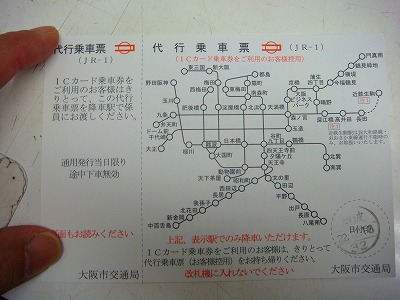 地下鉄代行乗車券AM10:30に出先からJRなんば駅に行くと人身事故で振替え輸送をしているので近鉄か地下鉄に行けとの事。地下鉄四つ橋線で大国町へ行き御堂筋線に乗り換えて天王寺へ行き谷町線に乗り換えて地下鉄平野駅に行くそこから徒歩でJR平野駅まで歩いて用事のあるマックスバリュー内の店に行きましたJRなら20分で行く距離を1時間もかけていく羽目に合うとは・・・JR平野駅にたどり着いた11:30頃には大和路線は動いていました、しばらく待てば楽に来れたものをついていませんね。