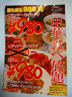 中華料理のバイキング安い中華バイキングが在ると誘われて食べに行きました。場所は大阪ミナミのナンバオリエンタルホテル小天龍ですホテルでバイキング・・・何やらゴージャスな雰囲気ですが行ってみれば気軽に入れる庶民的な飯店でした品揃えも豊富で味もしつこくなくまずまずの料理が食べ放題で並んでいます店内は絶えず満席なので料理が直ぐに品切れになり追加で並ぶのに少し時間が掛るのが難点ですかね、今日は取り皿が足りなくなって店員が各テーブルの空いた皿を回収して回っていました珍しいですね。人気メニューは焼き飯とシューマイ、から揚げ、焼きそばですか山盛り出てきてもすぐになくなっていましたから、お勧めは冷蔵庫の一番下に隠してあるチョコレートですしゃがまないと見えない所に置いてあるので知っている人しか食べれません、行く機会が有れば探してみてください絶品でした。何度も来ている知り合いの話では来る度にメニューが変わっているので定番メニュー以外何が出るか分らないみたいです。一度ダイエットを気にせずに腹いっぱい中華料理を食べてみたい人にはいいかもしれません時間制限は80分と長いのでゆっくり食べれますドリンクバーは300円フリーアルコールは1200円