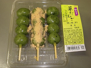 やまざき 草だんご山崎製パン草だんご きな粉付(3)YK1000ショップ100105円前に良く似た物を食べた時はきな粉の付け方が分からずわらび餅のように手前のスペースに全てのきな粉を入れて食べにくい思いをしたので、今回は正式なきな粉の付け方を考えました。袋入りのきな粉をだんごに掛けてクルクル回すと全体にきな粉が均等に付く・・・しかし今更だが通常は何も考えなくてもこの方法しか思い浮かばないな。味は少し暖めると美味しく頂けます、冷蔵庫に入れると硬くなりますご注意を・・・。あんこ入りよもぎだんごに、たっぷりのきな粉をまぶしました。ふんわり、上品な甘さです。竹包みきなこ草だんご