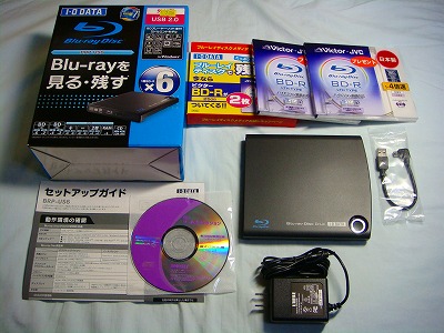 6倍速BD-R記録に対応したコンパクトサイズのBlu-ray DiscドライブIODATA BRP-US6大阪日本橋ソフマップザウルス2ポイント1298とビクターBD-R25GB2枚付きで特価12,980円と大安売りしていたので買ってきました。新製品のBRP-UP6の方が人気が有りますがまだ高いですからねこれで十分です、ただ写真右端に写っているUSBコードが短すぎるので使いにくいですね、あと5センチ長ければよかったのにコードだけを買い足した方が便利です。欲しかった物が安く買えて幸せなクリスマスイブでした。BRP-US6 ブルーレイ鑑賞やデータバックアップにオススメ ポータブルブルーレイディスクドライブ 【新品】【在庫品】