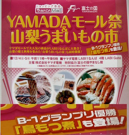 ヤマダデンキLABI1なんば店内ポスターB級ご当地グルメ「B-1グランプリ」で優勝した「甲府鳥もつ煮」が食べられると聞き4Fの催し場に行って来ました。多くの山梨名産品が並ぶ中「家庭で作れる鳥もつ煮」コーナーで「専用のたれ」と鳥もつの素材セット(レバー・ハツ・砂肝・きんかん)を実演販売で売る試食コーナーがあり出来たてのもつ煮を食べさせてもらいました、旨みが濃縮した美味しさでB-1グランプリを取るだけのことはありますね、ご馳走様でした。試食だけして買わずに帰ってきましたもつ煮にしては少し高いし家で作るとフライパンに匂いが浸み込みそうでしたから・・・。明日も開催しているのでお近くの人はどうぞ。B級グルメ 厚木会場で実際に使用されたタレと同じものを瓶詰めに致しました。甲府鳥もつ煮のタレ【山梨県知事賞】受賞商品