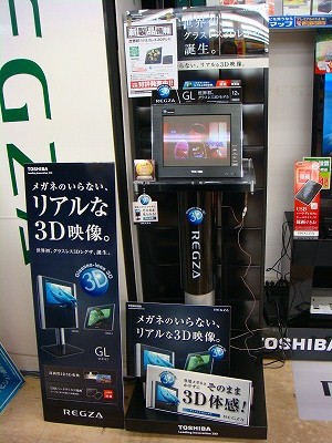 世界初、専用メガネなしで3D映像を視聴できる液晶テレビグラスレス3D液晶テレビREGZA 12GL112V型地上・BS・110度CSデジタル専用メガネがなくても立体映像として認識することができるテレビがついに市販されました。前から気になっていた製品なので早速仕事を抜け出して現物を見に行きました。12型で11万と少し高めの値段設定です、月末か来年初めには20型も発売される予定。では早速画面を確認、月泥棒の末娘ほっぺた少女が映っています。まーっどう表現したら良いものか12型にしては画像が荒れていますどの距離から見ればいいのか離れて見ると綺麗ですが小型テレビを遠くから見る人もいないだろうし・・・入力画像の為かもしれませんしこのテレビの特性の為に多少荒く見えるのかも知れませんね、あと映り込みの光が虹色(赤系統)になって見にくくなります。3Dは驚くほどではないですね専用メガネが要らないのは楽ですが少し見えにくい時もあるし他のお客さんは3Dに見えないと言っていたし欲しい人は売り場で良く確かめてから買って下さい、本命の20型が出てからが勝負でしょうが私からすれば、32型以上を出してもらわないと買う必要があるのかどうかすら分らない商品ですから・・・。【12/22発売★ご注文順に順次出荷】TOSHIBA/東芝 Glasses Less 3D REGZA 12GL1(12V型 グラスレス3Dレグザ液晶テレビ)