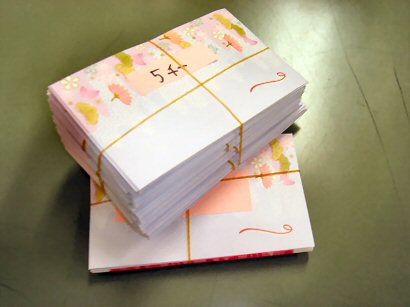 元日用のぽち袋今年の初仕事は福の神です。元日に出勤してくれた社員、パート、アルバイトに労をねぎらって渡します。会社の人間だけではなく現場の同じ部署で働く別会社の人にも渡します、良い意味では大盤振る舞い、悪い意味では付け届け・・・下手をすると賄賂ですかね。毎年、喜こんで貰っていましたが今回は渡す側です予備も含めて60枚で30万円・・・これが続く限りはうちの会社も安泰です。今回は私が喪中のため年始回りを外してもらう代わりに元日の福の神が回って来ましたがこちらの方が新年の挨拶が多かったですね、始めのうちは「喪中に付き欠礼します」などと言っていましたが途中から面倒になって普通に新年の挨拶をしていました、まぁ福の神が喪中じゃありがたみも半減ですからね。余ったぽち袋を経理に返して帰ってきましたが重大なミスに気がつき驚愕しています自分の分を貰い損ねていました・・・故人の罰が当たって貧乏神になったのかも・・・。新年の挨拶がまだでした、今年もよろしく・・・さいならー。お年玉袋 和風 (小) 紙袋入5枚