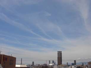 大阪の空を覆う大きく長い筋雲です米国債の格下げ後の世界情勢は日本の株や為替を見れば分かるように酷い物でした・・・これから各国の対応が悪い方に動けば次から次へと連鎖して世界恐慌に行き着きはしないかと不安で一杯になりますね。そんな時に空を見上げたらこの筋雲が見えたのでデジカメに残しておきました。遠く沖縄で被害を出した台風第9号 (ムイファー)のシッポが大阪まで広がっていたわけです。上海株式の下げが遠くアメリカにまで届くが如くです・・・さいならー。