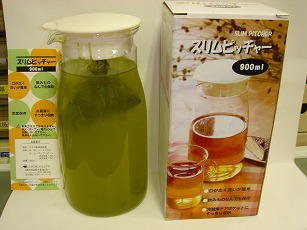 スリムピッチャー 900ml急須(きゅうす)の代わりに便利かと思い105円で買う、紙パックの茶葉を入れてお湯注ぐと簡単に緑茶の出来上がり・・・。喜んで茶碗に入れて飲もうとしたがガラス容器が熱くて持てない、早く茶碗に移さないとどんどんお茶が濃くなって行く・・・困った物です、やはり急須が一番だと再認識した日でした、さいならー。注意書きに「熱湯を入れるな」と書いてありました、商品は正しく使いましょう。
