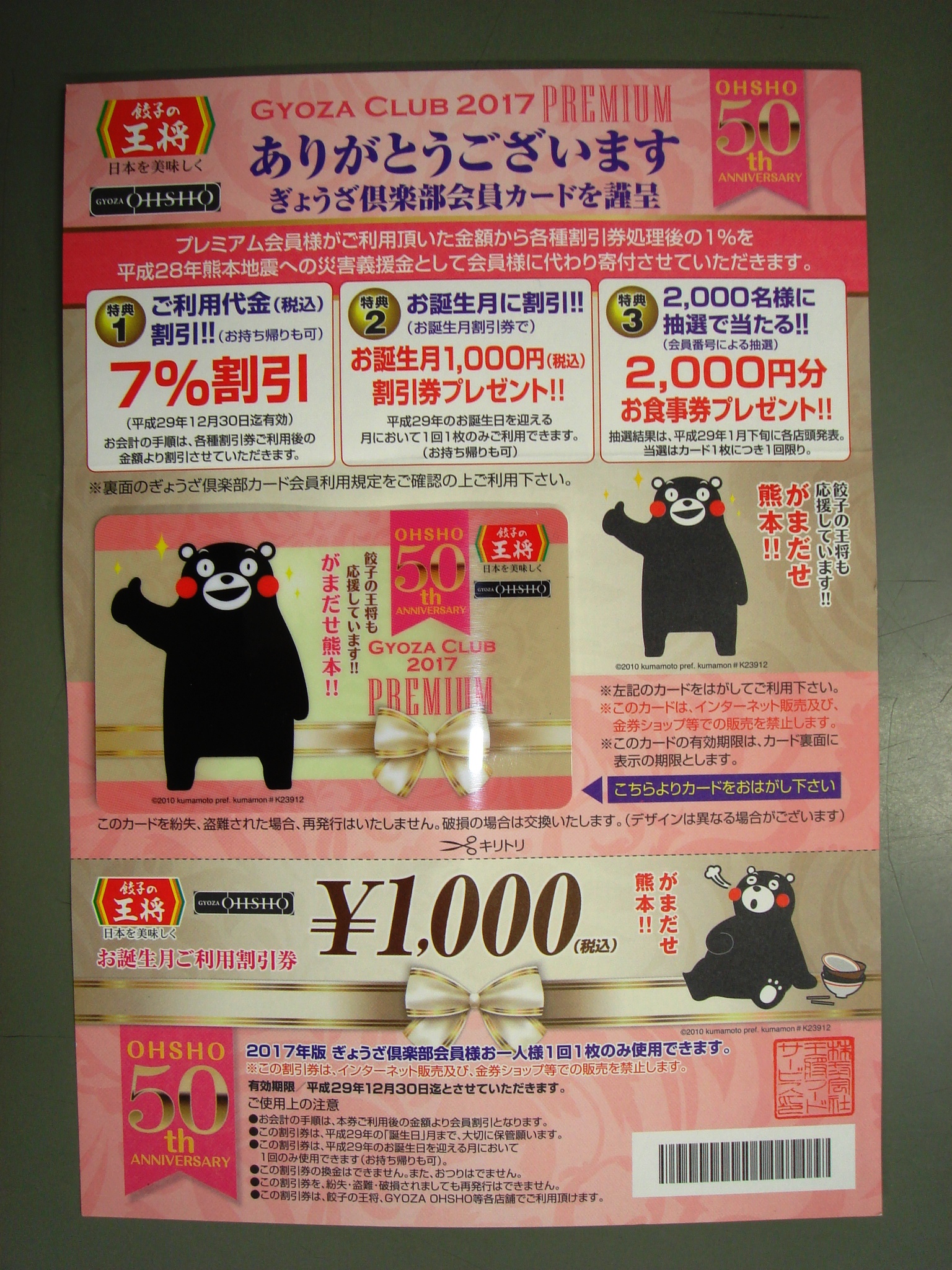 餃子の王将で毎年更新している「ぎょうざ倶楽部」で今年から始まったプレミアム会員食事の代金から7パーセント引き+1パーセントを熊本地震への災害復興資金へ寄付をする特別カード1000円の割引券も付いてます。獲得条件は専用スタンプカードを全て埋めるだけ・・・王将での食事代金500円で1個のスタンプがもらえて40個溜まると交換できる単純計算では500X40=2万円だが実際は700円の定食40回分で700X40=28000円以上9月16日からスタンプ2倍セールが始まったので2枚目を目指します。スタンプ20個での通常会員カード5パーセント引きも健在ですグループで食べに行くので意外と早く集まりましたが1人では無理でしよう・・・。