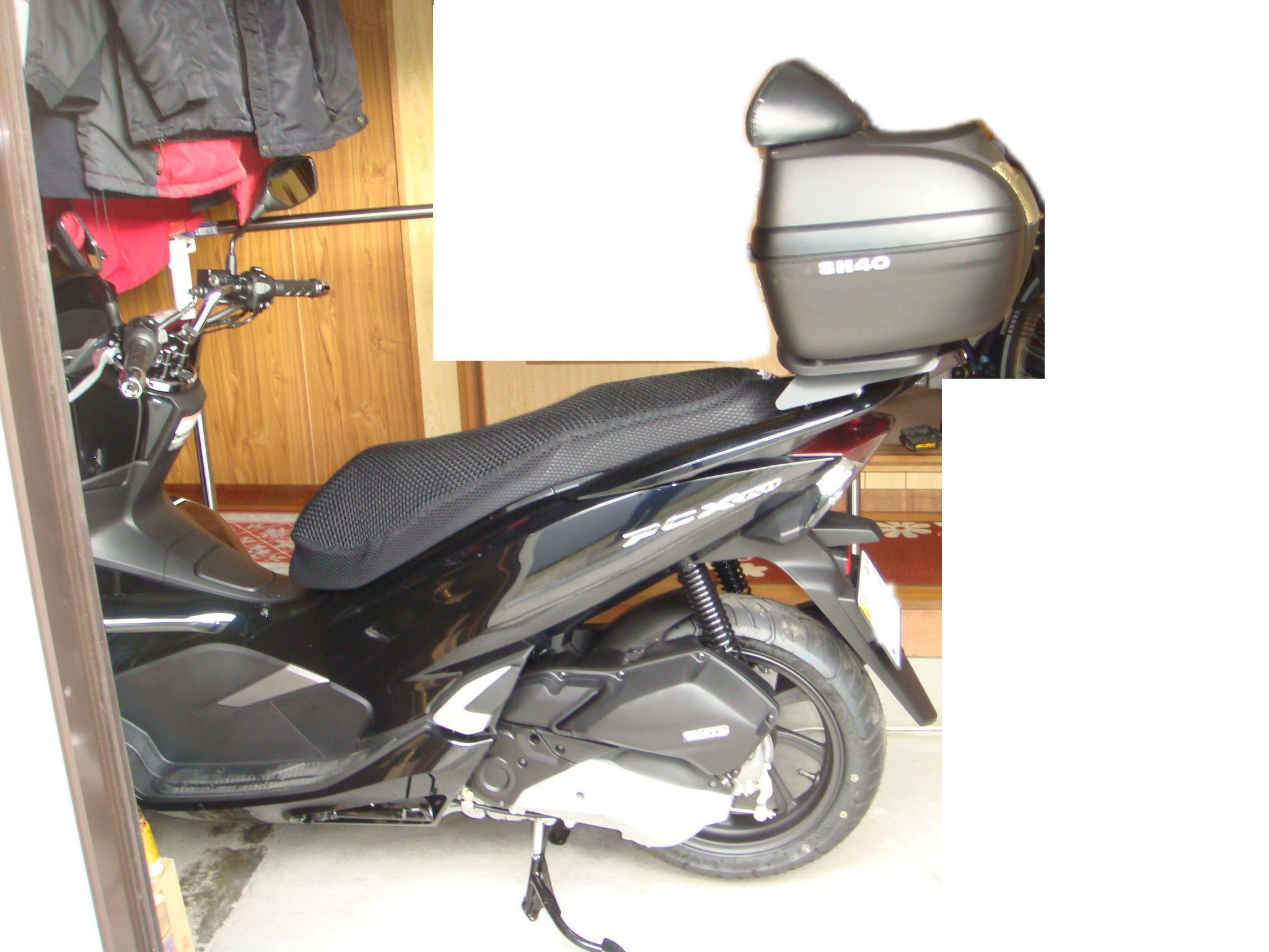 2018年新型スクーター ホンダPCX150 2BK-KF30 ABS 2018年4月20日発売リアボックス取り付け、前のPCX150からの付け替え箱分後方にだいぶと飛び出すかもと思っていたが1/3ほど出るだけでしたしばらくは箱無しで乗り回す予定でしたがあまりにも新型PCX150が目立ってしまい窃盗団に目を付けられても困るので古い箱を付けてシートカバー付けて駐車時はキーレス部をタオルで隠して分からないように、目立たないように気を付けています・・・。大阪の平野区はホントにアブナイ地域でしてノックアウト強盗とタクシー強盗で日本一だったところですからね、怖い怖い。D0B40100 シャッド SHAD SH40 トップケース ブラック 無塗装