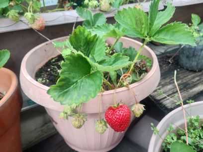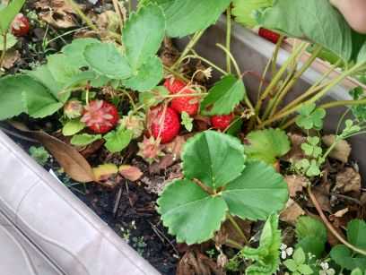 5月11日 屋上菜園のプランター植えの苺たち次々と色づき始めたそれに辺りがいい匂い~1年中で一番楽しい時期になったなあおもしろい形の苺発見43個収穫!累計58個