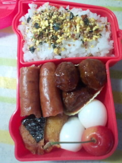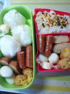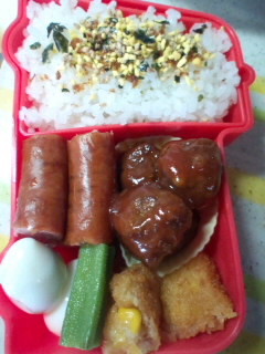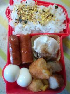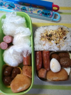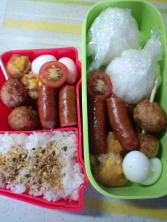 本日の子供たちのお弁当。今日から夏休みが始まったので子供たちはお弁当持ちでオフィスで預かってもらい私は地下鉄に乗って金山まで行きます。2ヶ月後に私たちもやることになる研修の最後のシメを2期前の先輩のを見学して終了式にも出席しました。午後は実践研修室に移るのでその引越しのための荷物の梱包でした。・・・といっても私は金山の実践室に入るのでちょっと荷物を移動するだけオフィスの場所や住んでる所別に3ヶ所の実践室に分かれます。金山は6名ですがその他の実践室に入る同期とはしばしのお別れ。寂しくなります。実践室は1期前の先輩たちと一緒に研修を受けます。明日からドキドキするなぁ。いよいよ机上研修が終わって実践なので働いてる気もします。早速ノルマもあるし・・・。2ヶ月がんばりますオフィスに入ればちょっとは楽になるよ~と聞いたので。子供たちはまぁおりこうに待ってました。昨日親父に言われたとおり息子を眼科に連れて行きましたがショックな診察結果が遠視ぎみの乱視だそうで・・・。近くと遠くが見えないのだそうですさらに少し炎症をおこしてるみたいで。はぁ~。私が乱視なので仕方がないのでしょうがかなりショック0.8しか見えてないみたいで。また後日診察です。目・・・だけは悪くしたら不便なのに・・・。ふぅ