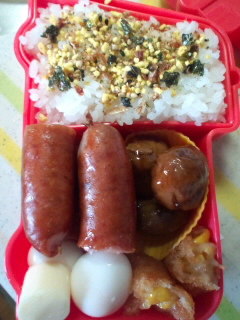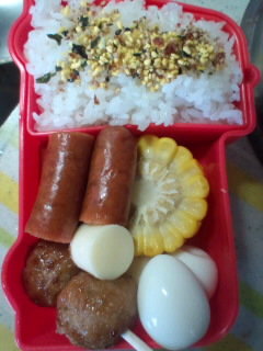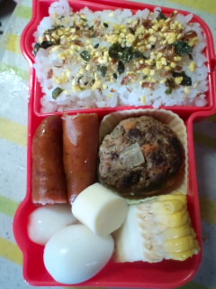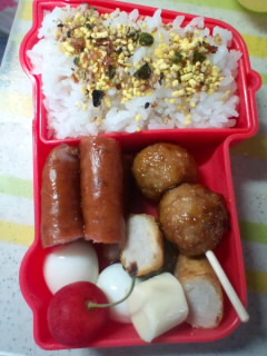 本日の息子のお弁当。今日はパパが会社お休みをとったのでとりあえず息子を園に送ってまたバザーをちらっと見てから駅まで送ってもらいましたパパが休みなので息子のにじ組も今日は辞退。迎えに行ってもらうことにしました。助かります。私の勉強のほうはだいぶ進んでます。家でも復習をしてるのですがなかなか思うように模擬試験の点が取れないです・・・一応100点満点で85点以上で合格なのですがだんだん不安になってきたなぁ。がんばるしかないのですが。今日の娘の給食。ちくわのいそべ揚げ・ごまあえ・味噌汁・ご飯・牛乳。