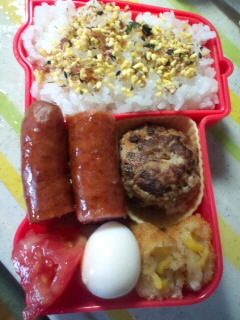本日の息子のお弁当。とうもろこしとチェリーは別容器で。ちょっとかばんがぱんぱんになっちゃいました。私は今日から別の研修室に異動になってまた研修です。出勤が9時半になってしまったのが難点です。息子を園に8時45分に送って車でオフィスに行ってそこから地下鉄に乗りますがダイヤの都合・道路状況でどうしても9時半には着きません。・・・9時35分です。しかも研修室の時計が5分早まってるので出勤簿には9時40分と記入・・・園にも少し早めに預けていいですかと聞いたら園長先生が「45分というルールですし他の方にも不公平だし 一度前例を作ると・・・」まぁそうですよね。私立じゃないし。融通はきかなかったです。なので年中さんママでいつも早めにきてるママに「ちょっと見ててもらっていい?」とお願いして会社へ向かうことにしました。研修中だけの我慢かなぁ。今日の娘の給食。煮込みハンバーグ・キャベツ・ビーンズスープご飯・牛乳。