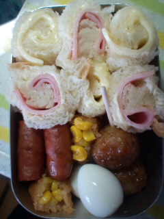 本日の息子のお弁当。初めてこんなパンでくるくるサンドイッチ弁当にしてみちゃいました昨日炊いた炊き込みご飯が残念ながら全然おいしくなくさすがにお弁当に入れられないので急遽こんな感じのお弁当。娘にもやったことありません。私の仕事は試験も終わってちょっとのんびりムード。正式な発表は明日ですが仕事から帰ってから息子を迎えに行く前に娘を歯医者に連れて行きました。小学校での歯科検診で乳歯に虫歯アリと診断されたので。今まで通ってた歯医者さんは以前そこは矯正歯科なのに反対咬合の相談だけで5000円かかるといわれたので歯医者を変えました。私が娘の口をのぞいても虫歯を発見できませんでしたが右の上のおくから2番目の横に穴があいてました先生がちょっと削って詰め物してみがいとくね~それで治療終わりだからね~で終了です。娘はよくがんばりました。私は自分に虫歯がなく歯医者も未体験なので虫歯の治療には時間がかかるイメージでしたが1回で終わってよかったです娘は先生から「ガム・キャラメル・ハイチュウ・ぷっちょのようなくっつくものは食べちゃだめだよ」と聞いてちょっとショックこれ幸いに「飴やグミやチョコや甘いものは控えたほうがいいですよね」と私。「今のままの食生活してるとまた虫歯になりますよ」当分おやつはせんべいだなウヒヒ。でも娘の虫歯にはショックです。すごく気をつけていたのになぁ。目も片方悪いみたいだし・・・。もう。今日の娘の給食。ヒレカツ・カラフルソテー・すまし汁・ご飯・牛乳。