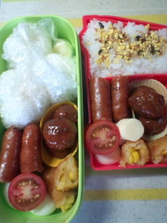 本日の子供たちのお弁当。今日から本格的に実践研修です。初日からやることいっぱいわからないこといっぱいでホントてんてこ舞いです聞かされてないこともいっぱいでもうどうしよう。と思っていた矢先子供を預けていたオフィスから息子が熱を出してるので戻ってきてくださいと電話が。昨日は私の先輩のお昼ご飯も食べちゃったほど食欲満点だったのに今日は何も食べず・・・。おわびのバナナケーキを持たせたほどです。あわてて戻って病院に連れて行ったら夏風邪でした熱が39度にもあがっていしまいました。健康優良児の息子が熱をだすなんて3年ぶり。ぐったりしちゃってかわいそうでした。明日自分の担当地区100件チラシを投函しなければいけないのでそれもできるかなぁ。とりあえず早くよくなってね。