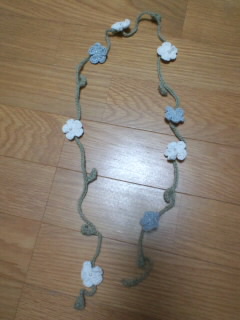 仕事場にもつけていけるかなぁ。ちょっと無理かなぁ。ラリエットです。写真ヘタで光っててよくわからないけど前に作ったのとほぼ同じですがあのとき編み図を残しておかなかったのでテキトーに編みました。こちらはネックレス。パールビーズとウッドビーズ。さらにお花のモチーフです。金具をつけてから気がつきましたがゴムテグスだし長いからかぶれるので金具・・・いらなかったかなもう少しいいデザインの作りたいなぁ。