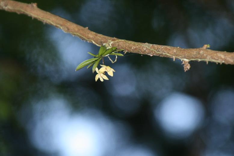 久し振りの仕事は老体に堪えますね(涙)。植物の好きな先輩から今年もカエランが咲き始めたよ、と教えられた。咲いている場所が分からず案内して頂いた。そこは道路に面した杉並木だった、あの杉の木の小枝に咲いているよと指される見上げると木の枝に寄生してその花はあった。カエランと教えられたが我が家の図鑑には出ていない。PCでも出て来ない。何科の植物かも分からないが根はセッコクに似ていて花は5ミリ程の小さなものだった。望遠で撮影したが手ぶれなのかピントが甘い。更に拡大可憐な花であった。正式名称をご存知の方教えて下さい。