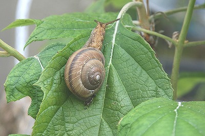 朝から変な天気、洗濯物お願いね~も忘れて雨に濡れそうやっとの思いで取り込みました。その時柏葉アジサイにかたつむりが・・・雨でご機嫌のようでした。黙々と葉を登るかたつむり、一体何を食べてるんだろう?今夜の自分の食事を連想しながらふとそんな事を思いました。5月は31日間真面目にブログを書きましたが未だ記入率は63.9パーセント6月も頑張るぞ~。応援宜しくで~す。