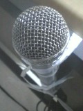 マイクをキーボードスタンドにビニール紐で縛って固定しています、はい。