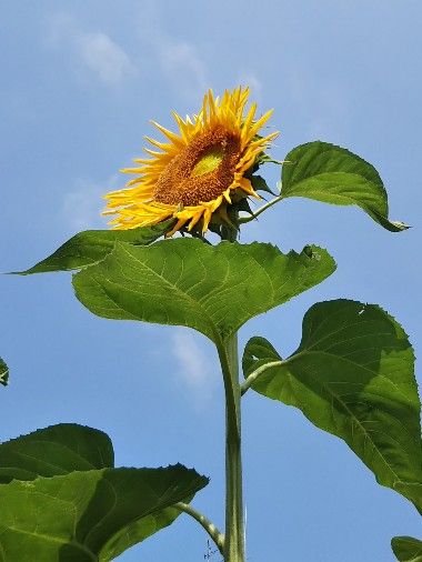向日葵の葉の裏に蝉の抜け殻2019  ベタながら夏の風物詩。