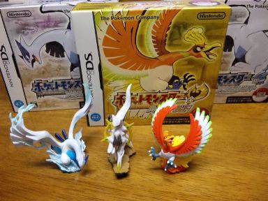 7-11で予約していた、今日発売のポケットモンスター ハートゴールド×1とソウルシルバー×2を雨の中買いに行ってきました。子供たちはソウルシルバー、私がハートゴールドです。ホウオウって、ルギアに比べて扱い悪いよね。アニメ第1話に伝説ポケモンを匂わせて登場しているのに、映画にも出してもらってないしね。7-11の複数予約特典のアルセウスと、ホウオウのフィギュアはちさに奪われて行きました。