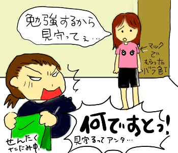 しうが「うちの3姉妹」にはまってから、私もイラスト日記が書きたくてうずうずしていたんですが、そんな悠長なことしてる暇なんてまったくなくて更新はたいてい携帯メール更新だしとかなんとかぐだぐだしてたんだけど、昨日ちょっと時間があったのでちさにペンタブを借りてサササッと書いてみました。ペンタブ難シス。ひでえ。しかも面白くもなんともねえ。やっぱりアナログでしっかり描いてスキャンが正解だな。デジタルペン入れとか考えられん。公開するのが憚られる出来だけれどここは公開すべきでしょう。ってことで。夏休みの宿題が終わっていないちさは、一人で勉強していると鬱モードに入ってしまうので一緒にいて欲しいと訴えてきたのでした。んで、見守りながらお絵かきタイム。何なんだかね~
