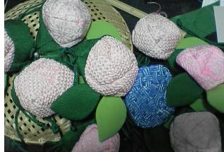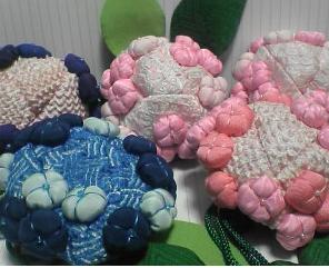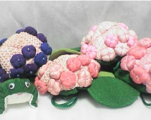 紫陽花と蛙雨降ってるから蛙は、元気ねいいわね=======古布細工は、同じようには出来ますが全く同じになりません着物を ほどいて作ります汚れの酷い所は避けますきっかりの数は、出来ません気に入った布でないとおらは、出来ませんそんな布選んでないで適当でいいといわれます適当で良いならおらに、でなく他の人に頼んでください作る人いっぱいいるのだからんだもんで生意気だといわれる