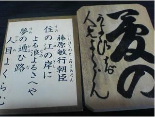久々の百人一首部屋が、ごった返しなもんでやっと、めっけたしかし、夢ってこう書くのね麦に見えるし右の木札は、下の句ね夢の通い路を 通ってあえないのはあの人が、夢の中でも人目を 避けているからであろうかと言う解説付いていた最近早く寝る夢を 見るためんでも、ここんとこの力仕事によりなかなか、夢みないこの間の続きの夢を見たいからだそう、夢の中でもウマい事行くわけもない=============皆 連休で どっかさ行ったのかなーいいわいなーおいらも、どっか行きてえヒッチハイクも、重量で、ガソリン減るから乗せてくんないかレンタカーってあるけどレンタバイクってないんだっけ?