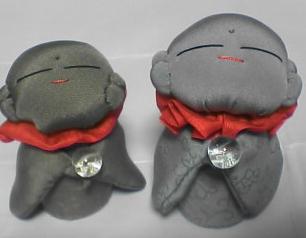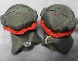 明日つーより今日の夕方隣町で、お友達とカラオケよーそのときに、例の三番叟とこのお地蔵様ね嫁入りなわけで右側のお地蔵様ねそんで、色の違い見てみると写真だと、左のお地蔵様濃いグレーに見えますが実物は、モスグリーンって感じなのにこんなんサイズで前に頼まれて、作った時飾ってあるお地蔵さんに会いに行ったら無理くり正面に、顔を引っ張ってあってびっくりこんな風に見える位置に飾ってくださいって感じなのですはい結局、この型紙は傘地蔵のやつですから傘地蔵だと、六体って、どうしても気になるし六体では、お買い上げが大変だと思って一体か二体でとなると傘を かぶっているとなんかねえってねそれで、上向き地蔵の出来上がりとなるわけですあと、四体あるんだけど脱落してるわけね夜もあけてくるしモスグリーンの地蔵さん、ヤフオクしますのでよろしくお願い申し上げますしかし、カテゴリーってえのは何にしていいかわかんね
