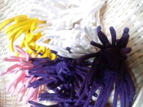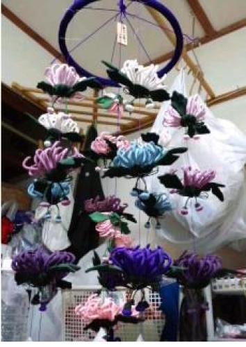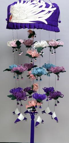 鳥の声す もう朝かということでこんな写真は、まずいんだけどねバックがね 写しちゃーねでも、ここまで黙々としてきた経過つーの根気以外に伝わるだろうか紺に写ってるのは 例のごとく房にあわした 青紫この状態が、縫いあがり曲げるのは、その人のセンスつーので扱いのこれまた難しい作品になってしまって曲げるわけですが左の小さい乱菊は蕾ふうにして見た方がいいかと折角小さいの作ったのですがどこに吊るすか迷い中心にチラッと入れてみました黄色の菊も入れることを 考えていたんですが色がまとまらないのでこの感じにしました一番長い 外側の10本の曲げ具合でこんなに違います外側のは 大きいカーブにした方がいいと思いましたが飾り手の感性にもよりますねカバーまでいかなかったわね眠いので寝るしかない