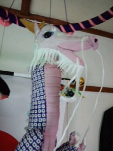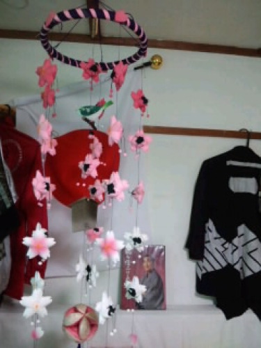 こんなんできましたああ ピンボケえーと吊るす所から 約178センチです輪の直径約 38センチ桜グラデーション桜28ケ絵馬 鶯 七宝毬です