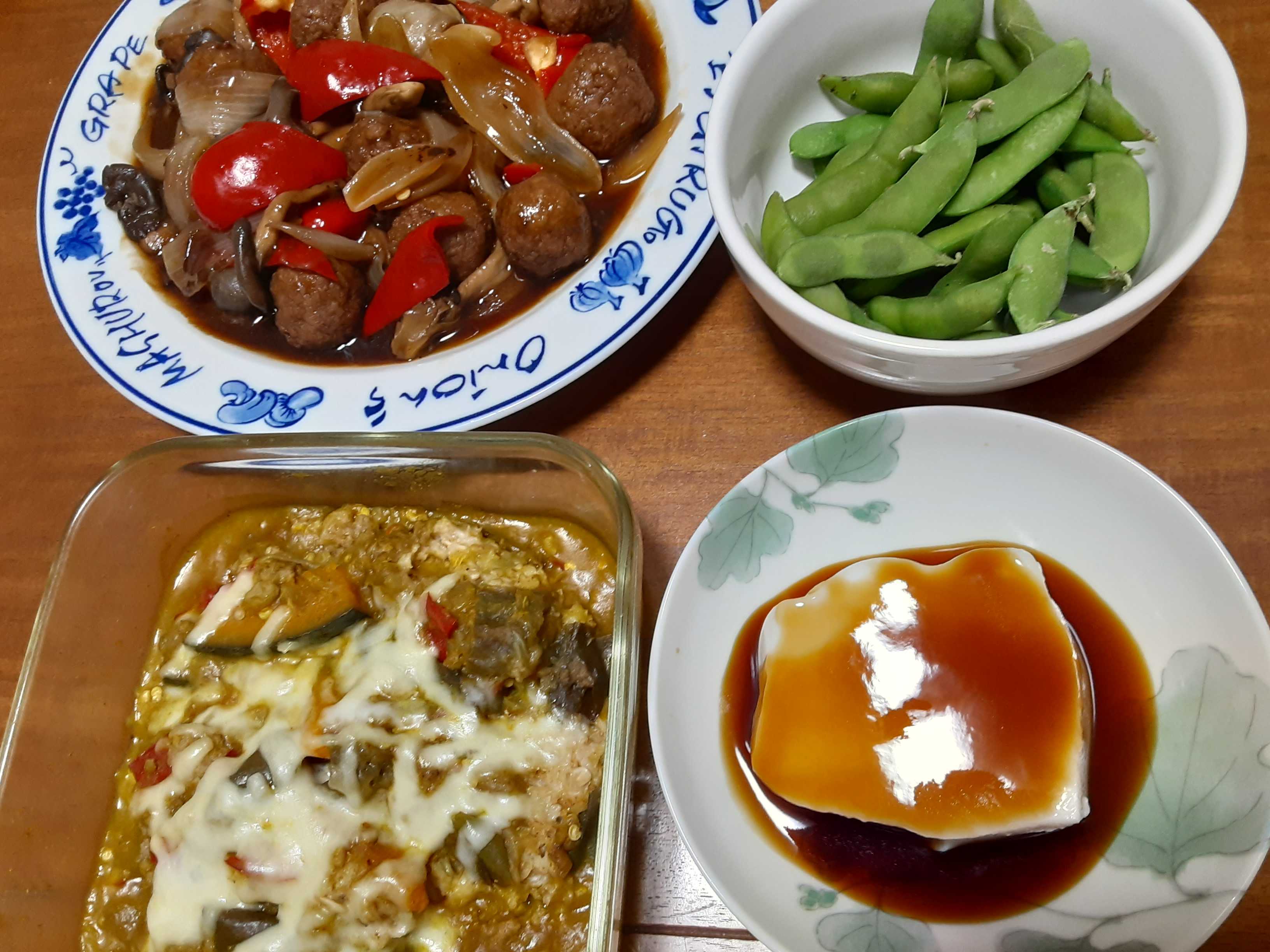 野菜とオートミールのチーズリゾット風・ピーナッツ豆腐・肉団子の甘酢炒め・枝豆