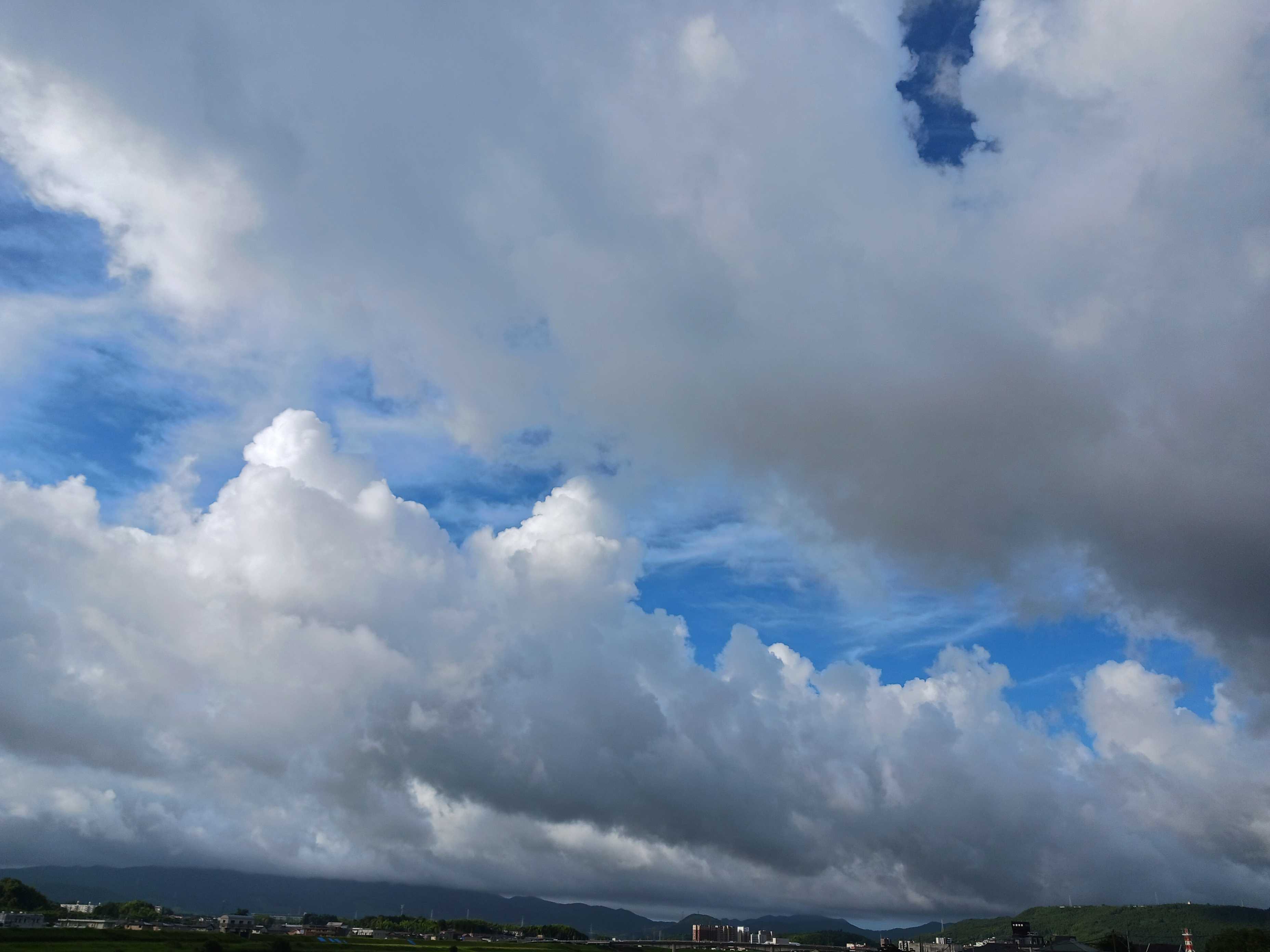 梅雨空と入道雲がせめぎ合い、晴れたり小雨が降ったり。