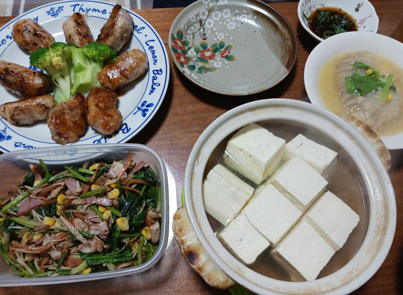 湯豆腐・ロール白菜のクリーム煮・トマトの豚肉巻き・ポパイサラダ