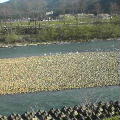 川辺の柳がうっすらと緑色 中州に白鳥の群が羽を休めている 遠いシベリア ご苦労様