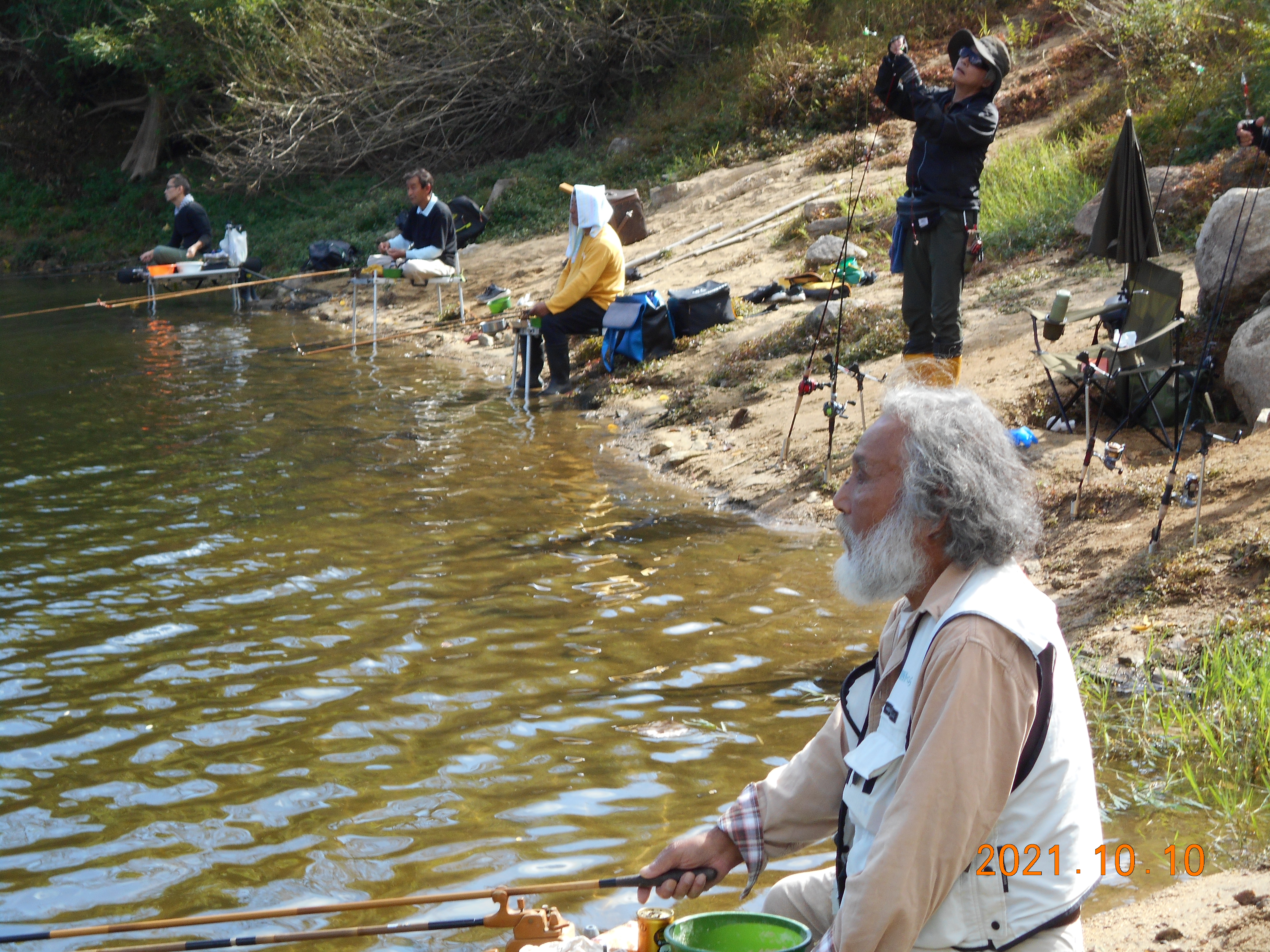 例会当日は4時半に集合(5時頃には駐車場満車状態)。11名の参加者で競技をスタートしましたが、前日とは違う状況なりました。スロープにたくさん釣り人が入りましたが2名が6時半までに2枚揃えましたが,ほかの人はなかなか当たりも出ない状態でした。ほかの釣り人の仲間の話ではどこの釣り場もアタリが遠いとの話でしたが、昼前ごろからはぼつぼつとアタリが出だし10名の会員さんに釣果がありました。近くで鯉釣りの釣り人が入り、なかなか当たりが出ない状況でした。
