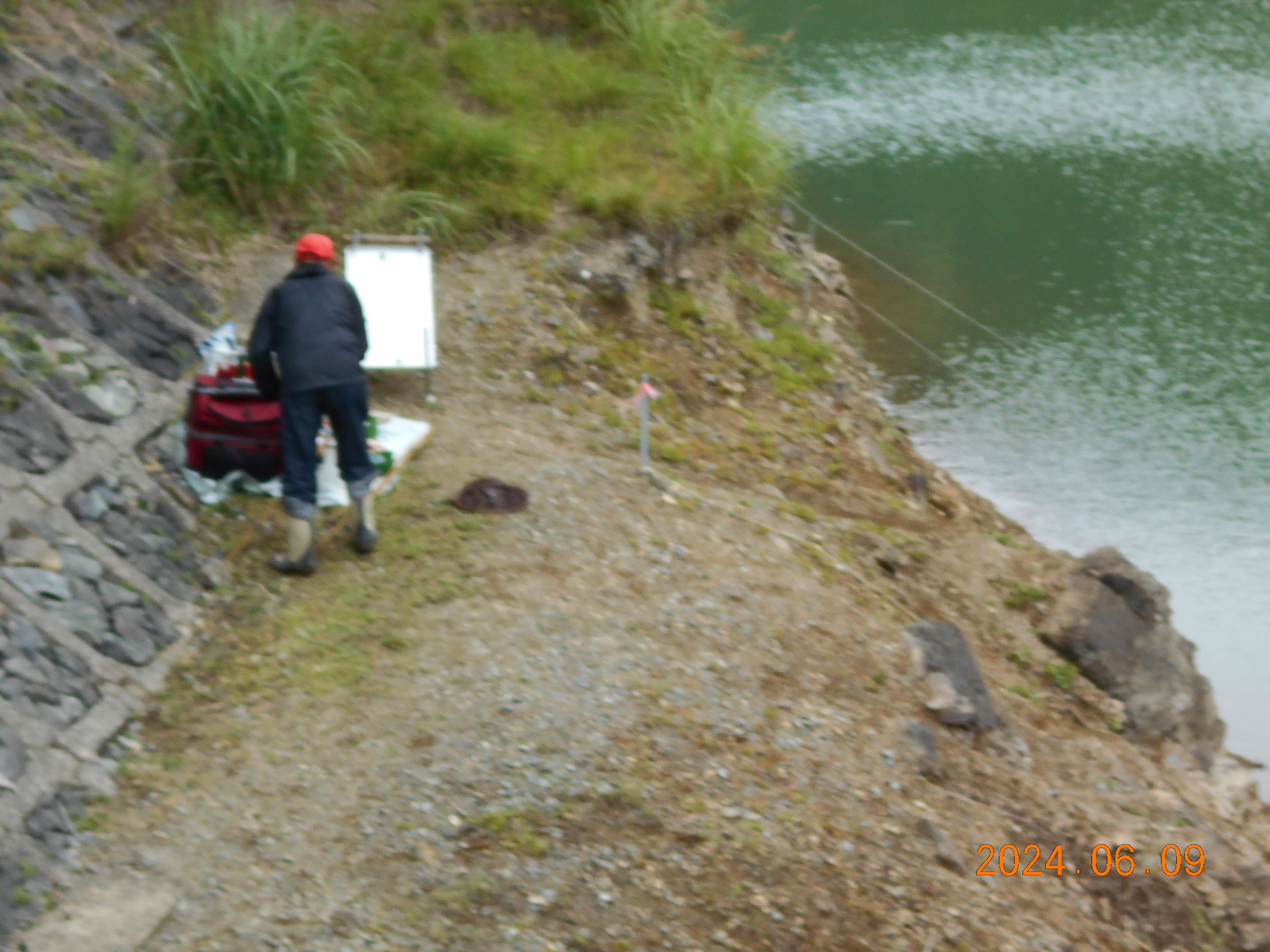 土曜日に現地に入り、ダムの状況を見て回りました。キャンプ場近くの左岸は工事がしてあり水位が高かったので入りにくく、右岸はなだらかで入りやすい。土曜日は天気も良く釣り人は多くこの水位では入る場所が無く水神さんの向かい側のスロープの所の浅場で竿を出しましたが、アタリは若干あるが釣果は無し。