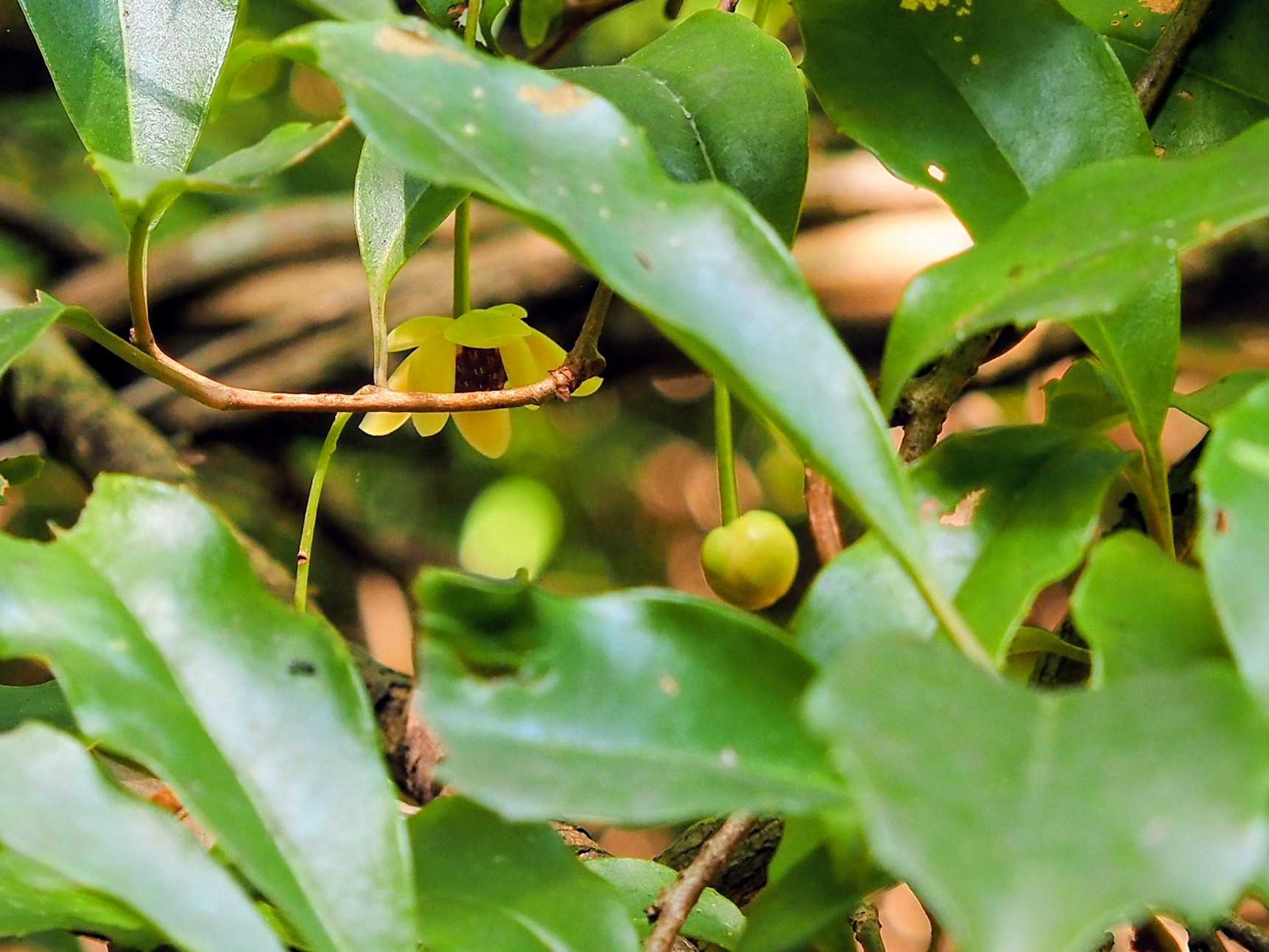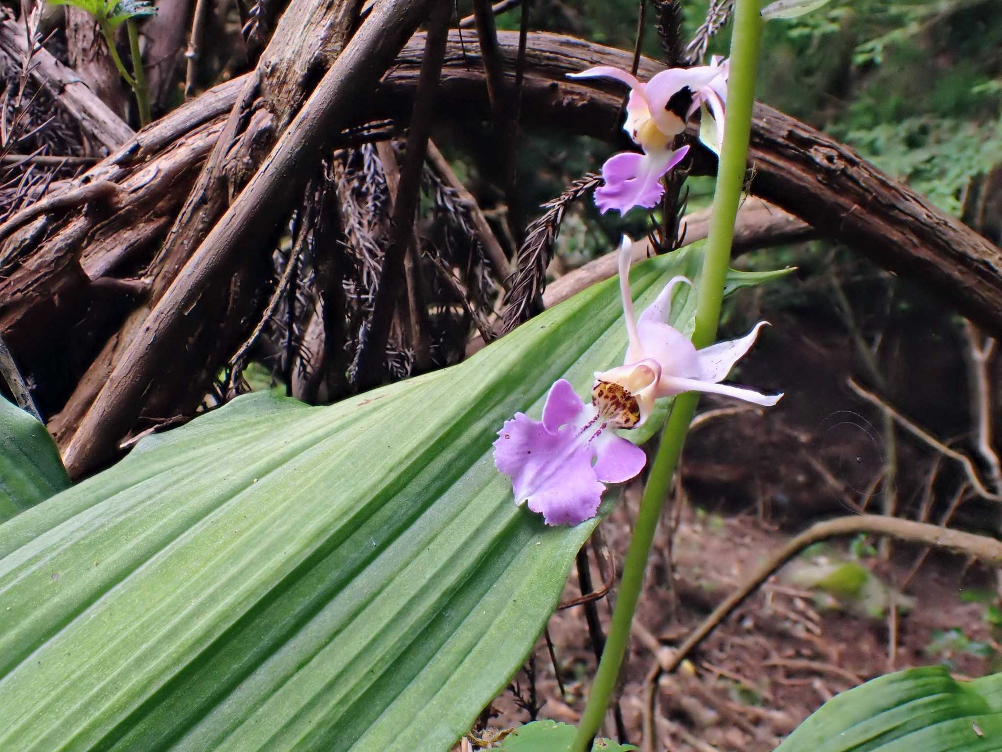 2025.8.16 若杉山 楽園〜落陽コース ナツエビネ数輪開花! #76(2781)今朝はナツエビネの観察に若杉山へ。8:31、楽園をスタート。天気は晴れ、気温26℃、弱風。参道を登って落陽コースに取り付きナツエビネの自生地まで歩くことに。自生地では、前回は一輪咲いていたが、今回は数輪開花!少し賑やかになっていた。夏海老根 ナツエビネ、ラン科膨らんだ蕾の株も近くの樹木を観察していると、木天蓼の果実 マタタビ、マタタビ科マタタビ属落陽コース折り返し地点でしばし休憩した後は、ジャレ杉経由で楽園まで下る。ジャレ杉 幹周11m、樹高25m10:28、今朝の山歩きの終了!
