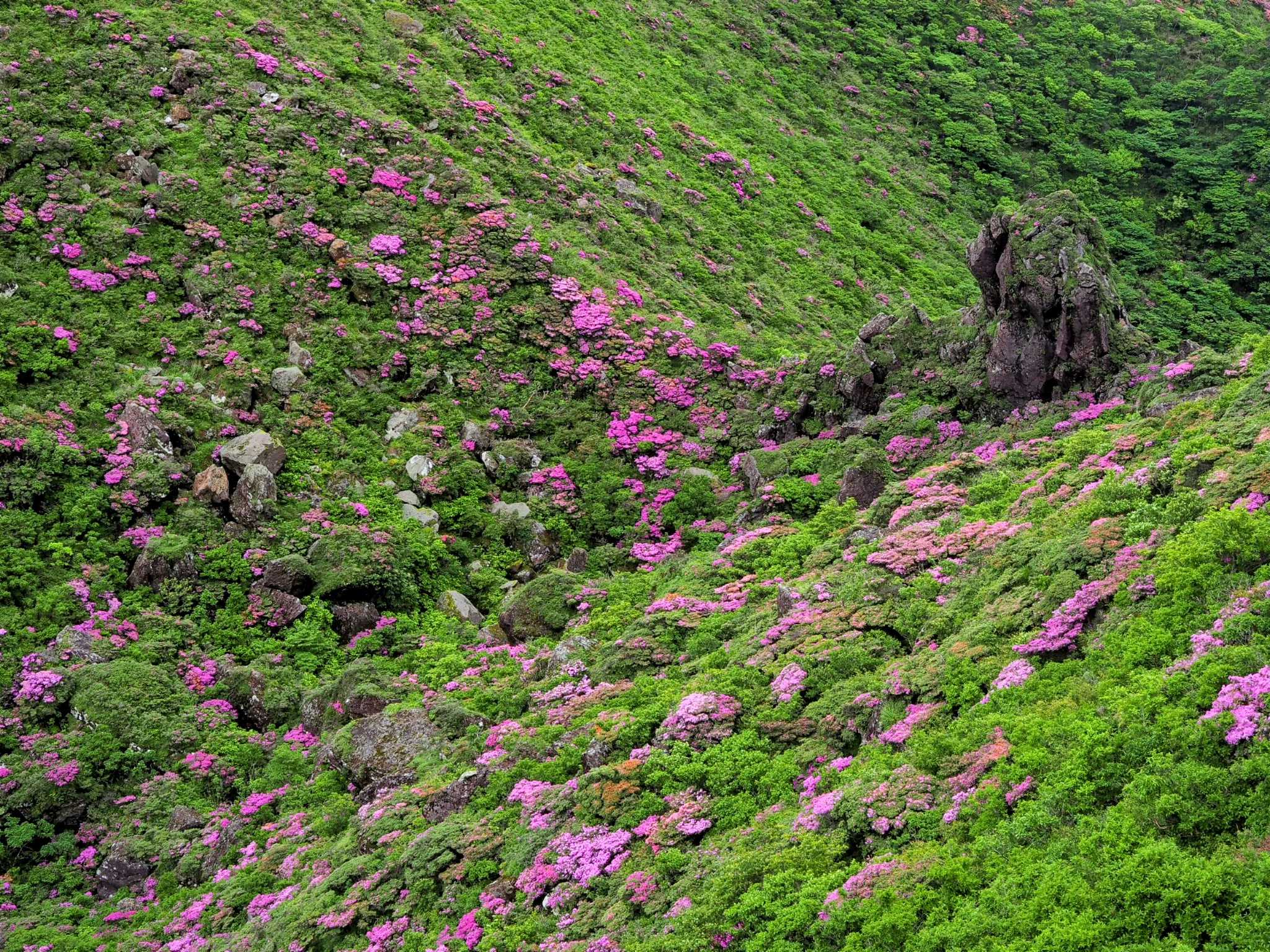 2025.6.17 由布岳 東峰〜西峰 ミヤマキリシマまだ見頃! #53(2758)今朝は、仕事を休んで由布岳へ。7:04、正面登山口をスタート。天気は曇り(のち晴れ)、気温22°C。牧場は相変わらず強風。ここからは登山道を登って行く。9:18、マタエ。ここはかなりの強風。一息ついてまずは東峰へ。今朝のミヤマキリシマ!マタエから上は、まだ見頃!西峰の取りつき地点の斜面東峰山頂直下から西峰を望む。東峰山頂で休憩した後は、マタエに戻り西峰へ。マタエから 青空に映えるミヤマキリシマ障子戸の岩場を通って西峰山頂へ向かう。雲がとれ青空が広がる、山頂から東峰を望む。西峰山頂からお鉢巡りの下り斜面を望む。今回は、お鉢巡りはせず、マタエに戻って下山することに。11:00、マタエから下山開始。12:25、牧場道から由布岳を振り返る。12:28、今日の山歩きの終了!今年もミヤマキリシマを楽しむことができて良かった!こちらはスタート時の由布岳山道沿いの草地で見つけた山野草稲森草 イナモリソウ、アカネ科 小さく可憐な花!