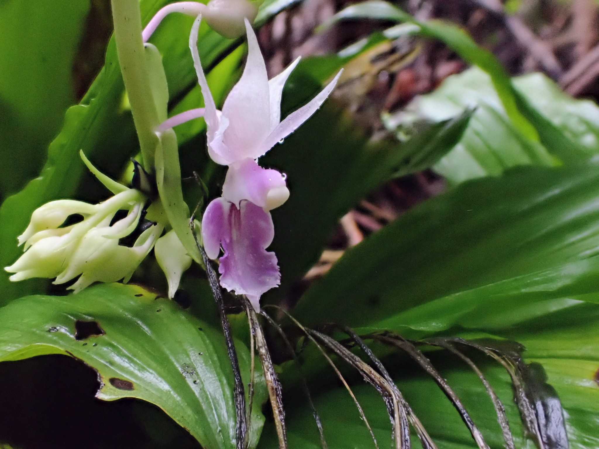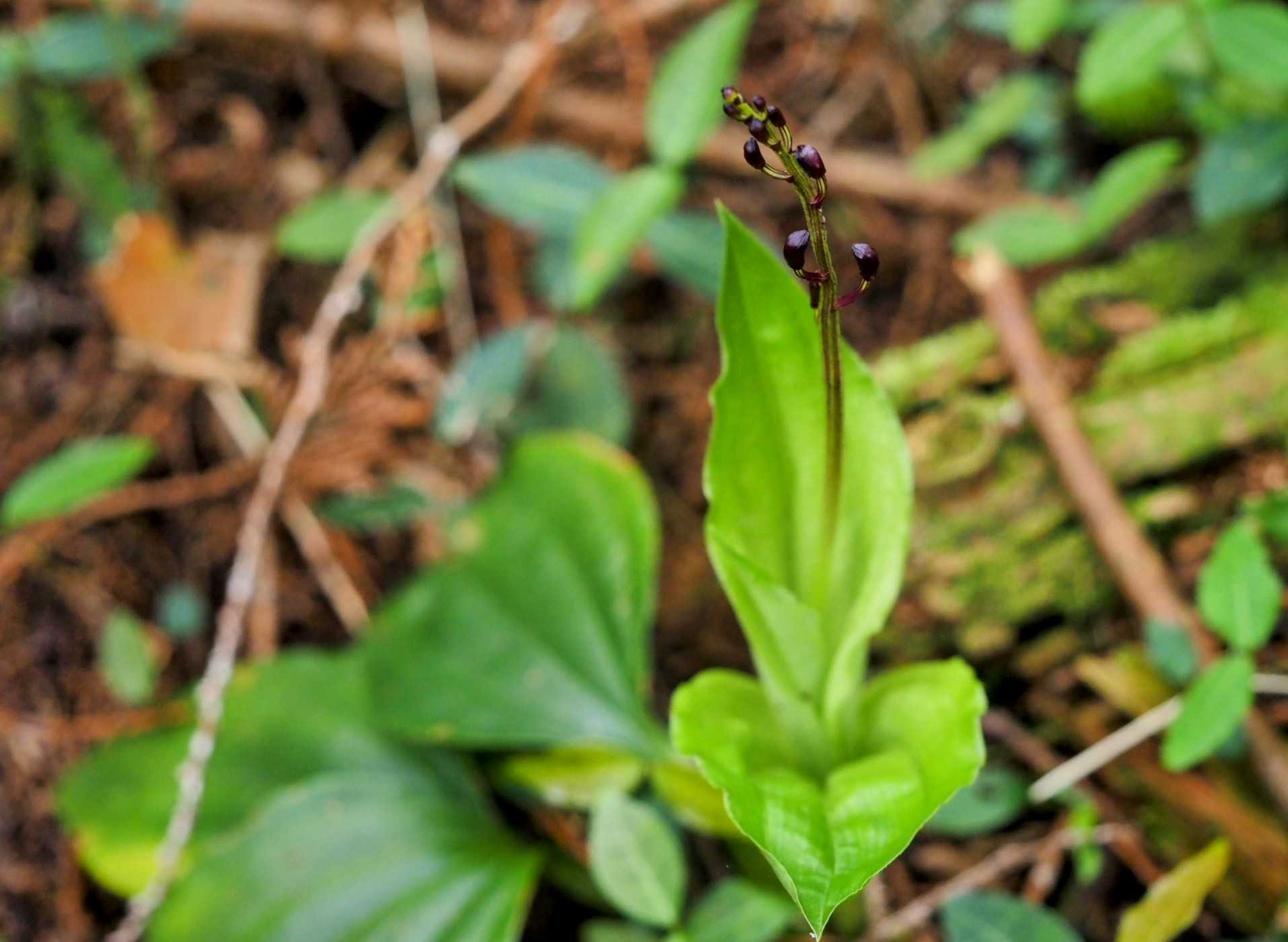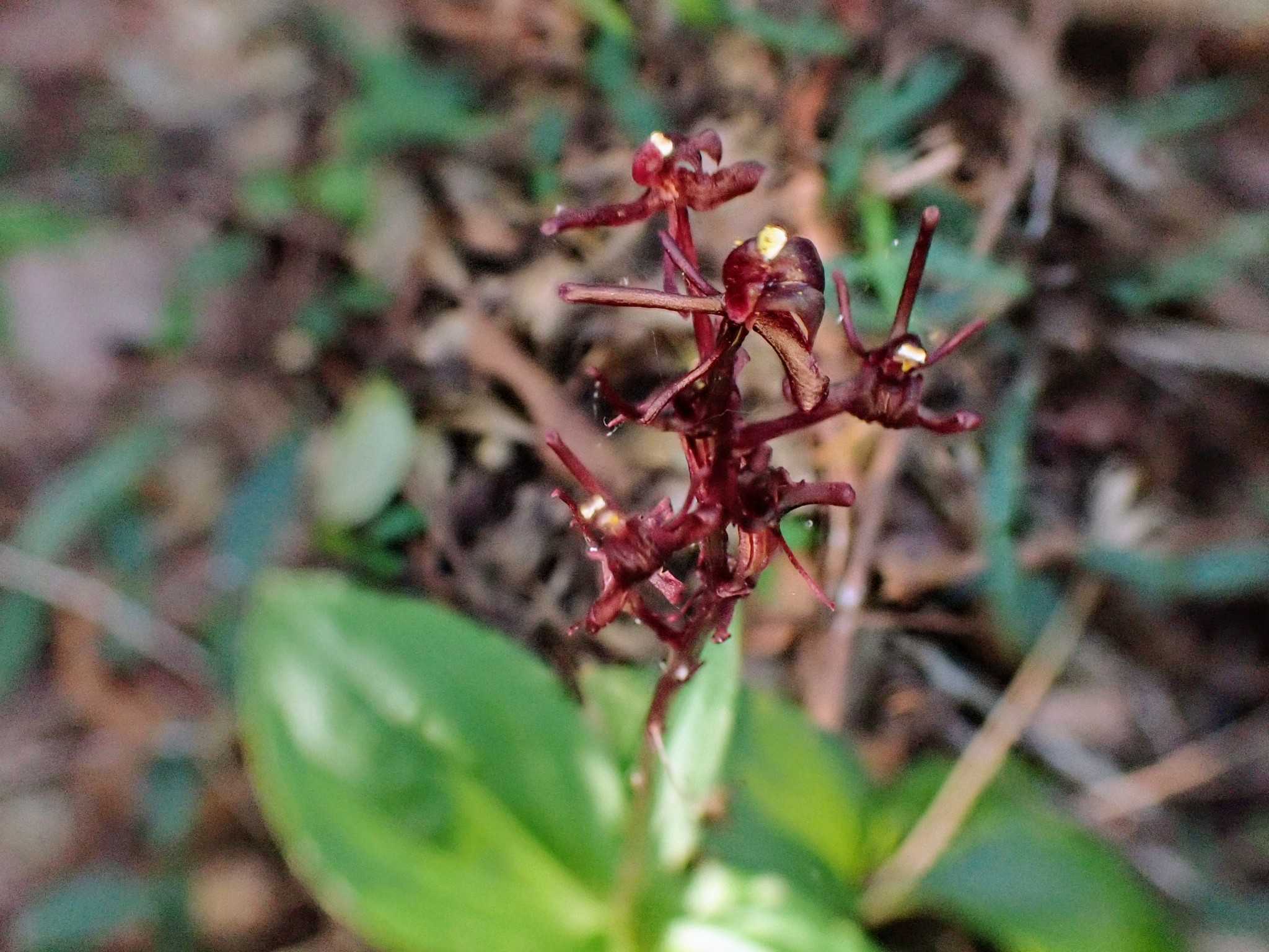 2025.6.29 牛頸山 キャンプ場下〜三市町山〜南峰 今朝のコクラン! #57(2762)今朝は、牛頸山へコクランの観察に行くことに。7:45、キャンプ場下をスタート。天気は曇り、気温24℃、弱風。まずは、最短コースでコクランの自生地へ。コクランはまだ沢山咲いていた!花は小さいので近づいて観察。黒蘭 コクラン、ラン科観察の後は牛頸林道を歩いて三市町山へ。途中、見つけた葉っぱ、花はまだ。大葉の蜻蛉草 オオバノトンボソウ、ラン科 三市町山からは黒金山方面へ進む。そして、南峰へ。眼下には天拝山。ここからは、エスケープルートの急斜面を下り、牛頸林道に降り立つ。後は、キャンプ場下まで歩く。川沿いに咲いていた花。姫檜扇水仙 ヒメヒオウギズイセン、アヤメ科支流の沢10:20、今朝の山歩きの終了!