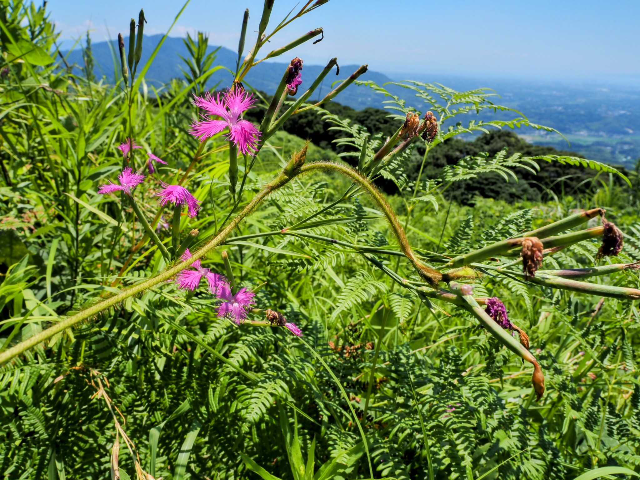 2025.7.23 三池山 普光寺〜山頂〜乙宮 カワラナデシコ開花! #65(2770)今日は、家の用事の後、大牟田市にあるお墓の清掃に行き、その後三池山を歩くことに。11:50、普光寺の先に車を停めてスタート。天気は晴れ、気温33℃。今日も暑い!コースはマムシ谷ルートで山頂へ。道は荒れており、体力を消耗する。12:55、山頂。その先の開けた稜線の草地には、河原撫子が咲いていた!河原撫子 カワラナデシコ、ナデシコ科展望を楽しみながら小休止。西方 有明海の先には雲仙岳が微かに見えている。南方 小岱山ここからは、乙宮へ下ることに。初めてのルートだったが、林道(乙宮林道)、車道歩きが70分と長かった。14:20、今日の山歩きの終了!参考普光寺上のマムシ谷取り付き地点手前の案内板。