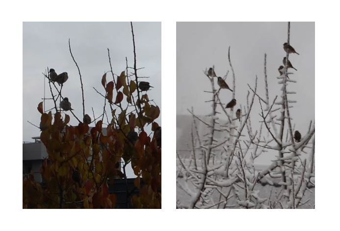 写真は20日と27日のもの。たった一週間でこんなに変化。あっという間に冬です!ベランダの横に木があって1年を通してスズメが。かろうじて残っていた葉が落ち枝ぶりがはっきり分かるように。そしたらスズメも丸見えに^^大好きな秋は終わってしまったけど冬はスズメ観察がたのしい♪