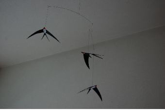 やはり空を飛ぶものが天井に浮いているのは、自然でいい感じ。ツバメの中心線を山折りにしただけだから、立体感ほぼゼロ。先月まで吊るしていた白鳥のモビールに比べ、横から見ると物足りなさが…。でも、ソファで横になってる時なんかに、下から眺めると、白×黒にちょこっと赤が飛んでいて、実に優雅な気持ちに。北海道に来てから見かけないツバメに会えたようで、なんだか春っぽくてうれしいなー♪専用化粧箱に入ったモビールをいくつか持っていて、シート状パッケージに入っているこのタイプは、はじめは心もとなくて抵抗がありました。でも、季節によって交換する我が家では、収納場所をとらない上にお手頃価格で、かえってありがたい感じになってきました^^ 楽天で買う → → 「消費生活のamazonストア」