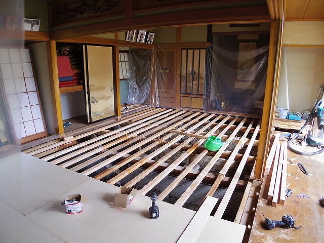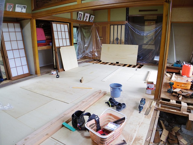昼までに手前の部屋の4畳分の床板貼りまで終わり、夕方暗くなるまで作業して、今日は和室2間の床板交換まで進んだ。