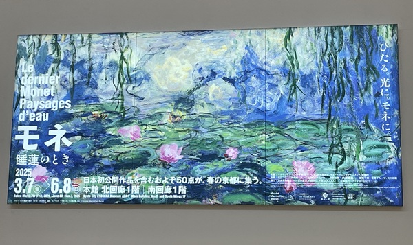 「埼玉県民の日」にぶち当たって上野では挫折した「モネ 睡蓮のとき」を観に、京都市京セラ美術館へ行ってきた。前回の上野での反省を生かして前売り券を購入していた。京都までの遠征だと天気のいい日に来たいので期日指定券はイヤだけど、人気のある展覧会はそうも言ってられない。開催直後なのでそんなに混雑しておらず、ゆっくりじっくりと鑑賞できた。苦労せずに最前列で絵を観られると満足度が高まる。クロード・モネ(1840-1926)の晩年、1910年以降の作品が中心となっている展覧会だ。撮影可の展示室が1室あった。《睡蓮》1916-1919年ごろポスターやフライヤーに採用されているこの展覧会を代表している絵。《睡蓮》1916-1919年ごろ晩年、年齢のこともあって白内障による視力低下に悩まされていたモネ。それは画風に影響する。軽やかさのあるパステルカラーから重厚なタッチへ。一番印象に残った絵はこちら。《睡蓮の池》1917-1919ごろイエローがきいている睡蓮の池だ。あと、藤の花の絵も良かったな。美術館内部の意匠が素敵だ。大きなガラス窓の向こうには東山連峰。モネだとグッズを買っちゃう。フェイラーのハンカチと缶が睡蓮のサブレ。雨は残念だったが、ゆったりとモネ作品を鑑賞できて満足な日になった。「モネ 睡蓮のとき」は6月8日まで開催される。京都市京セラ美術館 京都府京都市左京区岡崎円勝寺町124