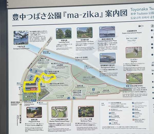 今は黄色で囲ったところのみオープンで、再来年にはドッグランやマルシェ、遊具広場、バーベキュー広場が出来、夢洲の万博会場の樹木を移植する計画もあるらしい。