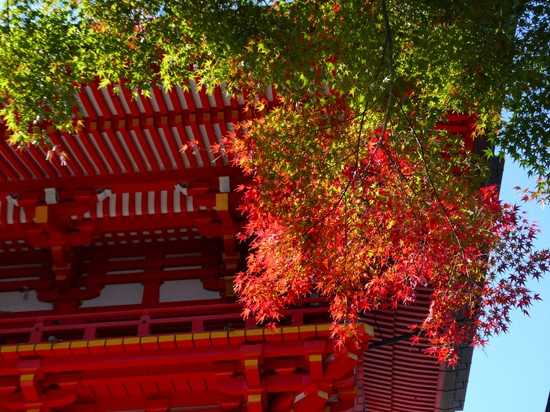 本数は多くないが、朱塗りの楼門に映える紅葉があった。