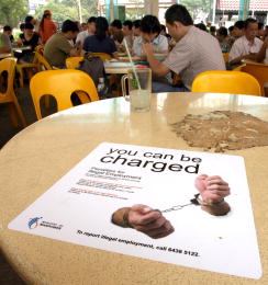 [The newpaperより抜粋 4 October 2006]An MOM spokesman said the campaign aims to make employers, workers and the general public aware of illegal employment and its penalties.[訳] MOMの広報担当者は、このキャンペーンは雇用主、労働者、そして一般の人々に違法雇用やその処罰についての意識を持たせるためのものだ、と言った。※MOM(The Ministry of Manpower)とは、シンガポールの省庁の一つ。日本語訳は「人的資源省」。[あらすじ]違法雇用に対する意識を高めるため、MOMは食堂のテーブルに「手錠をかけられた写真」を貼るというキャンペーンを行っている。[コメント]シンガポール近隣諸国からの労働者を、安い賃金で違法雇用している会社があり、シンガポールでは現在社会問題となっているようです。違法労働者は著しく不利な条件(作業中に怪我した場合の保険など。)で働いているとのことです。特に建築現場などでは事故が発生しやすいので、雇う側も雇われる側も考えて欲しいものですね。日刊シンガポール新聞