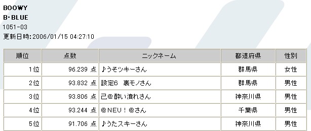 2005年から2006年へと年も変わりました!あけましておめでとうございます。本年もよろしくお願いいたします。実は大晦日の23:30から元旦のAM9:30まで、不覚にも眠ってしまいました(爆)元旦の昼になってようやく活動開始の♪うたスキーですw結果発表が大変遅くなりすいませんでした!【12月31日現在(ほぼ最終結果でしょう)】※確認の時間により順位が多少違う場合があります------------------------------------------------------------------※訪問いただいている皆さんの状況です! 参考までに『全国1位』も載せておきます。【男性POPS】 1.I LOVE YOU / 尾崎豊 [1位 / 99.707 点 / うっちさん] [2位 / 99.327 点 / KATZEさん] [3位 / 99.313 点 / ぽんきちさん] [4位 / 99.190 点 / ♪ふろう♪さん] [5位 / 99.162 点 / Taka-Kさん] [7位 / 98.631 点 / ちろたんさん] [8位 / 98.132 点 / 美莉亜さん] [12位 / 97.110 点 / こうへいさん] [16位 / 96.507 点 / うっきいさん] [19位 / 96.424 点 / B’Z藤本久子さん] [34位 / 95.421 点 / 通常の3倍食う猫さん] [37位 / 95.096 点 / けーまさん] [55位 / 94.302 点 / 沙羅さん] 2.ルビーの指環 / 寺尾聰 [1位 / 99.872 点 / うっちさん] [3位 / 98.885 点 / 美莉亜さん] [4位 / 98.769 点 / Taka-Kさん] [6位 / 97.904 点 / ♪ふろう♪さん] [7位 / 97.898 点 / だいしんさん] [8位 / 97.236 点 / トベペンギンさん] [9位 / 96.911 点 / ちろたんさん] [12位 / 96.667 点 / ぴあのさん] [14位 / 96.558 点 / リバー はっぽうさん] [16位 / 96.038 点 / まろちょこ.さん] [22位 / 95.508 点 / KATZEさん] [24位 / 95.224 点 / うっきいさん] [40位 / 94.036 点 / 華宮 流(闇火)さん] [45位 / 93.637 点 / 沙羅さん] [70位 / 92.802 点 / 0ザ☆フールさん] [78位 / 92.687 点 / Amyroseさん]【女性POPS】 3.Everything / Misia [1位 / 99.500 点 / まろちょこ.さん] [2位 / 98.999 点 / トベペンギンさん] [3位 / 98.946 点 / 美莉亜さん] [8位 / 97.585 点 / ちろたんさん] [9位 / 97.500 点 / ぴあのさん] [29位 / 95.953 点 / 通常の3倍食う猫さん] [33位 / 95.812 点 / 沙羅さん] 4.まちぶせ / 石川ひとみ [1位 / 99.706 点 / B’Z藤本久子さん] [2位 / 98.455 点 / トベペンギンさん] [4位 / 98.640 点 / けーまさん] [6位 / 98.516 点 / 美莉亜さん] [8位 / 98.304 点 / ちろたんさん] [9位 / 97.903 点 / 沙羅さん] [10位 / 97.414 点 / うっきいさん] [16位 / 95.715 点 / リバー はっぽうさん] [36位 / 94.614 点 / Palishさん] [37位 / 94.475 点 / まろちょこ.さん] [38位 / 94.287 点 / ぴあのさん] [58位 / 93.479 点 / 華宮 流(闇火)さん] [62位 / 93.350 点 / Amyroseさん]【男性演歌】 5.雪國 / 吉幾三 [1位 / 99.131 点 / B’Z藤本久子さん] [2位 / 98.616 点 / Taka-Kさん] [7位 / 97.162 点 / まろちょこ.さん] [8位 / 96.759 点 / 美莉亜さん] [22位 / 94.396 点 / KATZEさん] [25位 / 94.179 点 / うっきいさん] [36位 / 93.523 点 / 沙羅さん] [38位 / 93.370 点 / みんみんさん] [40位 / 93.259 点 / 快館 うえちゃんさん] [70位 / 92.179 点 / ちろたんさん] [79位 / 91.908 点 / リバー はっぽうさん] [96位 / 91.446 点 / 0ザ☆フールさん] 6.氷雨 / 佳山明生 [1位 / 99.557 点 / B’Z藤本久子さん] [4位 / 99.161 点 / Taka-Kさん] [8位 / 98.480 点 / うっきいさん] [10位 / 98.422 点 / 美莉亜さん] [19位 / 97.174 点 / まろちょこ.さん] [33位 / 96.128 点 / Palishさん] [36位 / 96.030 点 / みんみんさん] [49位 / 95.455 点 / リバー はっぽうさん] [50位 / 95.373 点 / 快館 うえちゃんさん] [71位 / 94.415 点 / 沙羅さん] [86位 / 93.983 点 / ちろたんさん] [89位 / 93.909 点 / KATZEさん] [90位 / 93.885 点 / Amyroseさん] [96位 / 93.645 点 / 華宮 流(闇火)さん]【女性演歌】 7.津軽海峡・冬景色 / 石川さゆり [1位 / 99.943 点 / B’Z藤本久子さん] [3位 / 99.708 点 / まろちょこ.さん] [5位 / 99.373 点 / けーまさん] [7位 / 99.158 点 / Palishさん] [10位 / 99.050 点 / 美莉亜さん] [17位 / 98.671 点 / みんみんさん] [18位 / 98.646 点 / ちろたんさん] [19位 / 98.504 点 / 快館 うえちゃんさん] [26位 / 98.208 点 / 沙羅さん] [45位 / 96.977 点 / うっきいさん] [90位 / 95.352 点 / リバー はっぽうさん] [92位 / 95.215 点 / Amyroseさん] 8.時の流れに身をまかせ / テレサ・テン [1位 / 99.968 点 / B’Z藤本久子さん] [6位 / 99.545 点 / けーまさん] [7位 / 99.404 点 / まろちょこ.さん] [8位 / 99.267 点 / ちろたんさん] [11位 / 98.735 点 / 美莉亜さん] [28位 / 97.497 点 / 沙羅さん] [46位 / 96.773 点 / リバー はっぽうさん] [58位 / 96.203 点 / 快館 うえちゃんさん] [65位 / 95.956 点 / みんみんさん] [69位 / 95.813 点 / ぴあのさん]【男性アニメ】 9.翔べ!ガンダム / 池田鴻 [1位 / 99.814 点 / ネコ魔身 (青)さん] [3位 / 98.809 点 / 美莉亜さん] [4位 / 98.164 点 / Taka-Kさん] [5位 / 98.121 点 / トベペンギンさん] [6位 / 97.607 点 / Palishさん] [8位 / 97.248 点 / Angu-guさん] [9位 / 97.171 点 / うっきいさん] [10位 / 96.496 点 / ちろたんさん] [13位 / 95.607 点 / 己(疲れ気味)さん] [15位 / 95.236 点 / ぴあのさん] [21位 / 94.922 点 / 通常の3倍食う猫さん] [24位 / 94.845 点 / 沙羅さん] [39位 / 93.734 点 / 0ザ☆フールさん] [51位 / 92.301 点 / 華宮 流(闇火)さん] [53位 / 91.980 点 / 虎次さん] [77位 / 90.288 点 / リバー はっぽうさん]【女性アニメ】 10.残酷な天使のテーゼ / 高橋洋子 [1位 / 99.990 点 / ちろたんさん] [2位 / 99.974 点 / KATSUさん] [3位 / 99.838 点 / Palishさん] [4位 / 99.818 