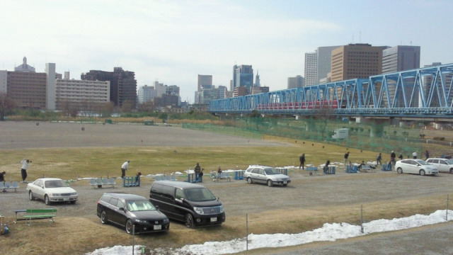暇ツブシはゴルフ練習、ティップネス、スーパー銭湯、映画あたりかな?今日は多摩川の河川敷きの「六郷ゴルフセンター」に行ってきました。JR蒲田から徒歩10分で京急蒲田。ここから二駅で六郷土手駅。徒歩3分ほどで河川敷きの打ちっぱなし場に着きました。プレハブ小屋の受付で1400円で100発の籠をもらって練習開始。川に向かって200ヤードほどのところですが、平坦なので距離がどうもわかりずらい。風も強くて・・・あまり気のりしない。早々に退散!どっかで飯でも食ってかえろっと!向こう側に見えるビル群は川崎です。