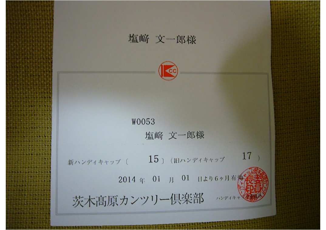 本日、倶楽部からハガキがきました。新ハンディキャップ 15やりましたね―っ! です。目標達成!!2012年10月 初ハンディ 242013年1月 年明け 23・・・1個減った2013年3月 21・・・月例で優勝したから2013年7月 17・・・4個も減った 月例優勝2014年1月から 15・・・夏ごろ80前半が多かったから?とりあえず目標(65歳までにHC15になる!)を達成しました。もーこれからは ボチボチ やります。このくらいで楽しく廻れたらいい!!15を大事にキープします。